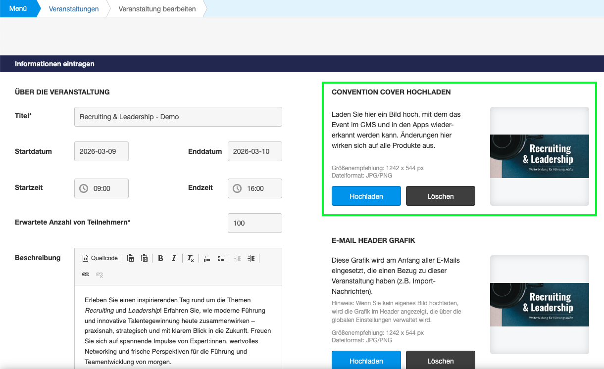 Sie können die Grafik für das Convention Cover auch als E-Mail Header Grafik festlegen. Die wird dann auch in allen eventbezogenen E-Mails verwendet. Die erforderliche Bildmaße sind identisch.