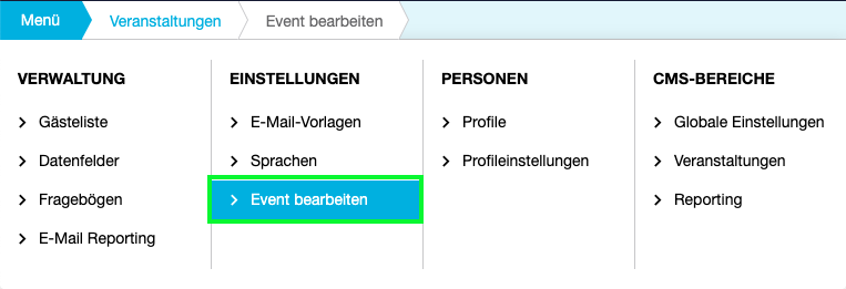 Im Veranstaltunsgbereich des CMS finden Sie im Abschnitt "Einstellungen" den Button "Event bearbeiten".
