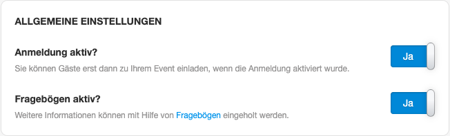 Fragebögen: Sie möchte weitere Angaben von Ihren Teilnehmenden erfassen. Dann aktivieren Sie diese Option. Weitere Informationen zum Erstellen der Fragebögen, finden Sie in diesem Artikel.