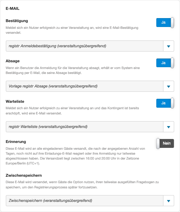 Organisieren Sie hier welche E-Mails automatisch nach bestimmten Aktionen verschickt werden sollen.