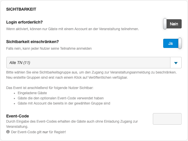 Sichtbarkeit: Definieren Sie über diese Einstellung, ob Ihre Veranstaltung nur für eine bestimmte Gruppe sichtbar sein soll. Klicken Sie auf den Switch und wählen Sie im Anschluss Ihre gewünschte Gruppe aus.