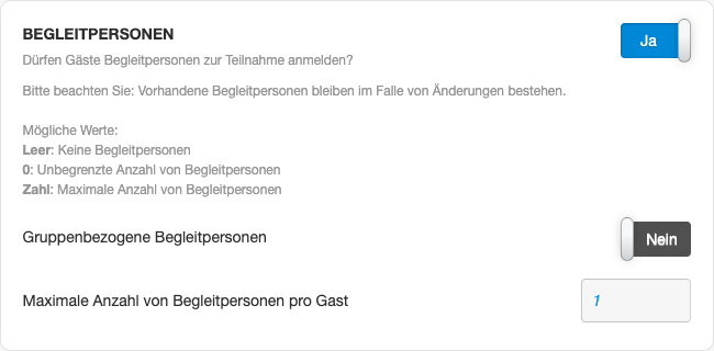 Legen Sie fest, ob Teilnehmende weitere Begleitpersonen anmelden dürfen. Dies kann auch pro Gruppe definiert werden.