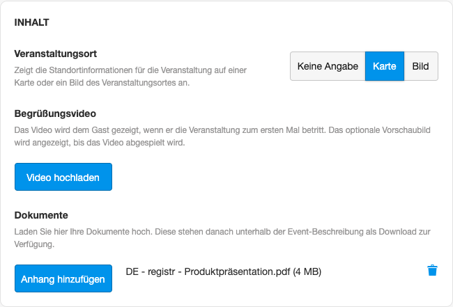 Ein optinales Begrüßungsvideo kann hier hochgeladen werden zur Promotion des Events.